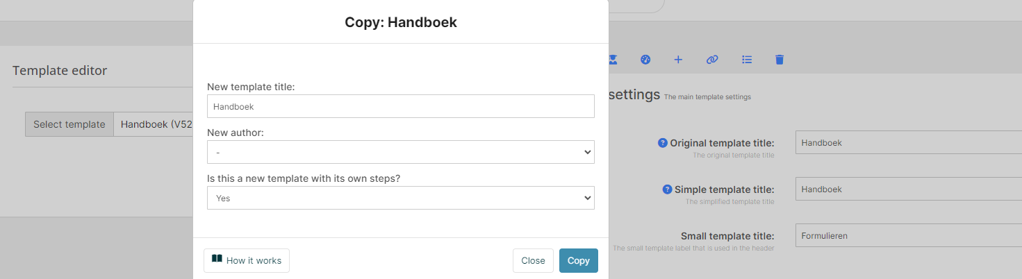 In this popup you can give your new template a new name. In addition, you can choose the new author and specify how you want to duplicate the steps.