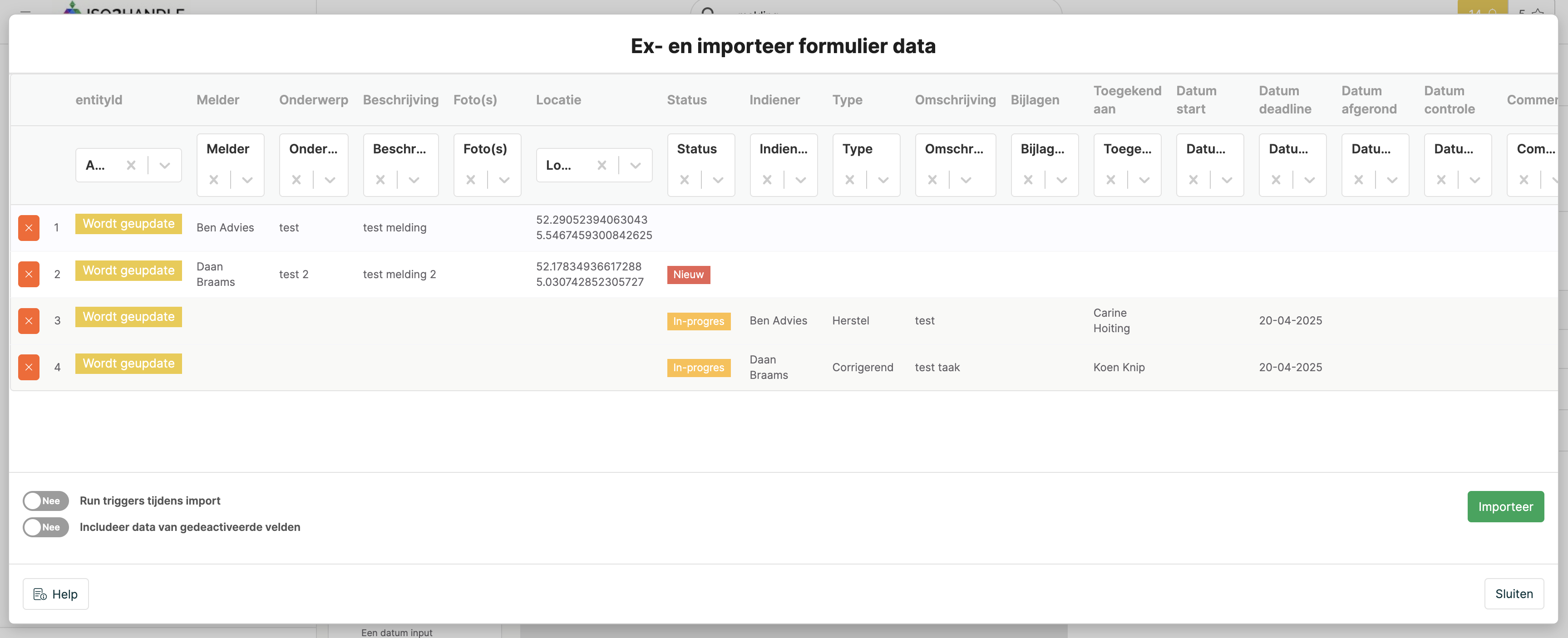 In ISO2HANDLE vindt je tal van formulieren waarin je registraties kunt toevoegen. Soms heb je echter al registraties en wil je deze snel en eenvoudig toevoegen. Speciaal hiervoor biedt ISO2HANDLE een Excel upload mogelijkheid. Deze functie is beschikbaar in ieder formulier en kan gebruikt worden met zo veel registraties als u wilt.